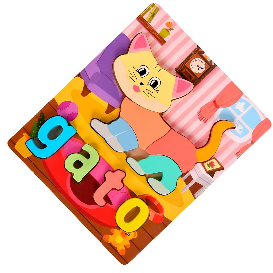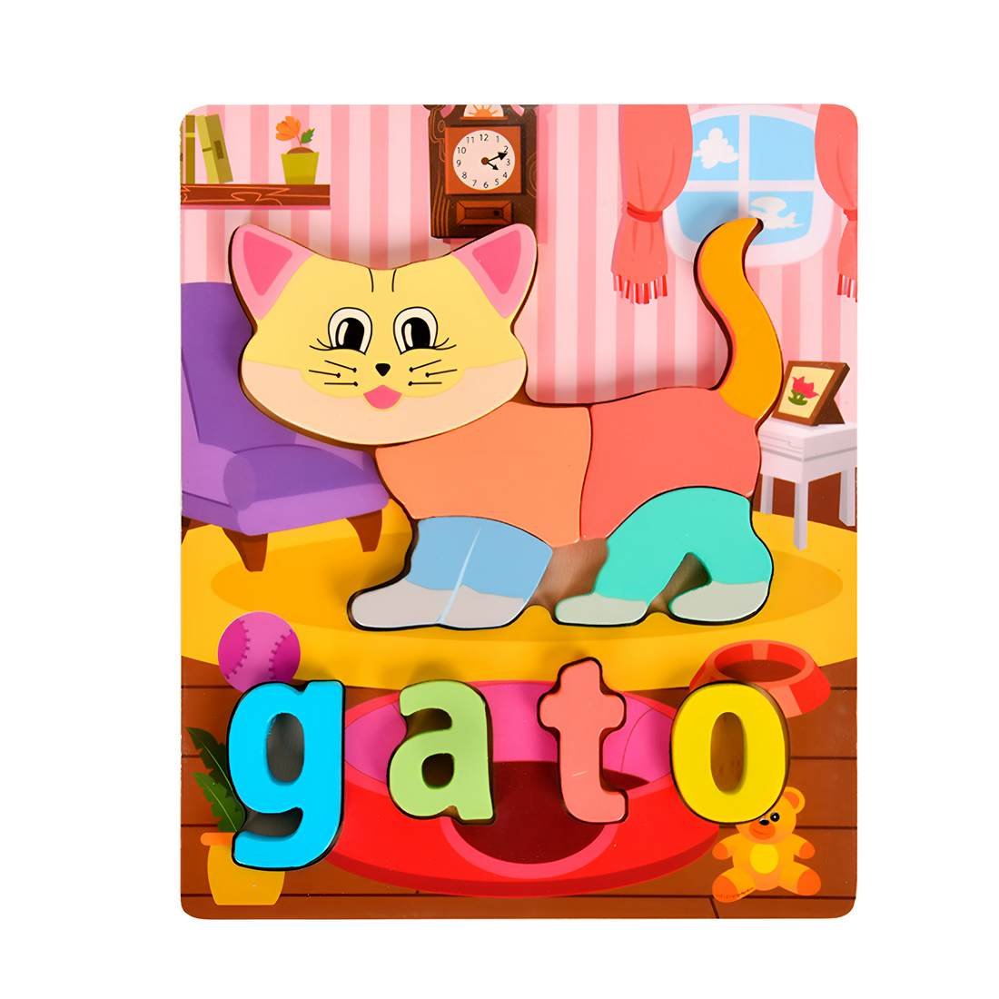 Rompecabezas de madera Gato. Juego educativo para niños que fomenta memoria, coordinación y aprendizaje de letras desde los 3 años.